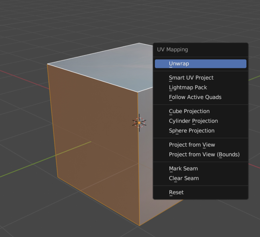 The Unwrap method will manually unwrap the UV map based on how faces and edges connect with each other. This method works by cutting along manually added seams to flatten the surface of the mesh. The default option is useful for organic shapes.