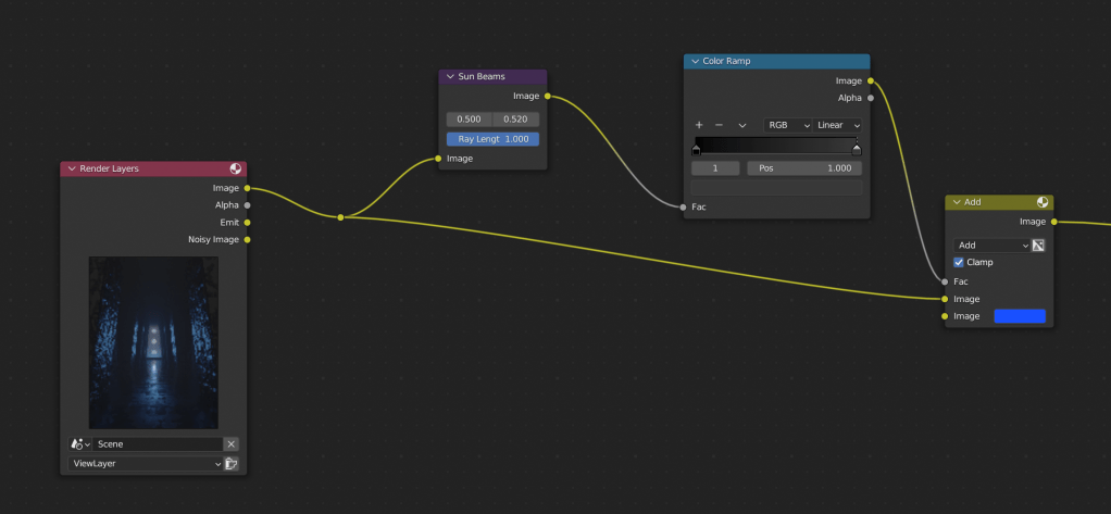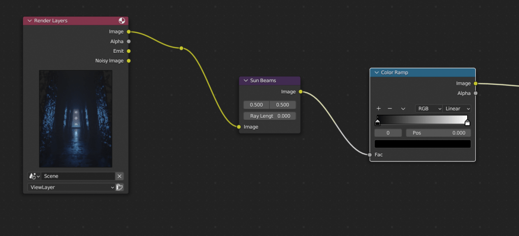 3. Add in Sun Beams and a Color Ramp node. Connect the nodes up like so. This will act as the mask for the sun beams.
